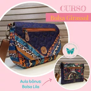 Neste curso você aprenderá produzir a bolsa Girassol, uma bolsa com alça transversal, estilo carteiro que contém um bolso todo charmoso na aba, com fechamento em zíper, outro bolso sem zíper na parte frontal e também contém bolso na parte interna. A bolsa Girassol pode ser feita tanto em máquina industrial quanto em máquina doméstica. O curso da bolsa Girassol contém moldes em tamanho real.